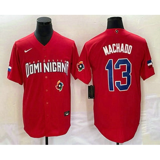- Men's Dominican Republic Baseball #13 Manny Machado 2023 Red World Classic Stitched Jersey