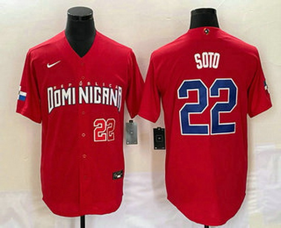 - Men's Dominican Republic Baseball #22 Juan Soto 2023 Red World Classic Stitched Jersey