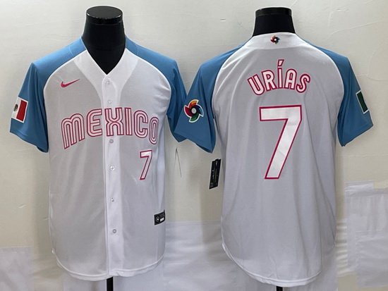 - Men's Mexico Baseball #7 Julio Urias Number 2023 White Blue World Classic Stitched Jersey1