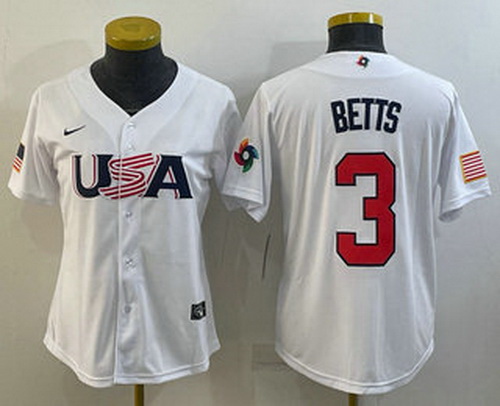 - Women's USA Baseball #3 Mookie Betts Number 2023 White World Classic Replica Stitched Jersey